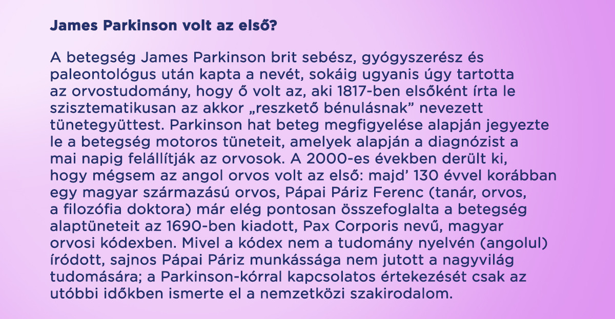 Magyarországon a legfrissebb felmérések szerint 35-40 ezer embert érint a „reszkető bénulásnak” is nevezett Parkinson-kór. Noha a betegség a tudomány mai állása szerint nem gyógyítható, a korszerű kezeléseknek köszönhetően a beteg akár hosszú évekre visszakaphatja gondtalan életét.